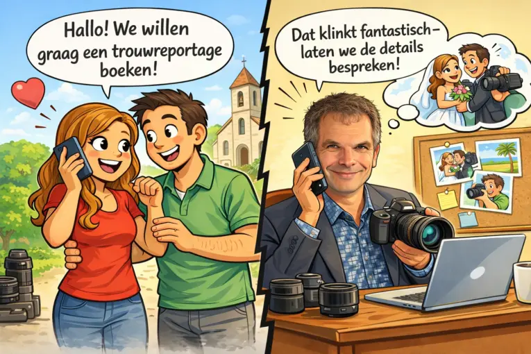 Veel bruidsparen voelen zich ongemakkelijk voor de camera. Maar dat hoeft geen obstakel te zijn. We zorgen dat je je op je gemak voelt.